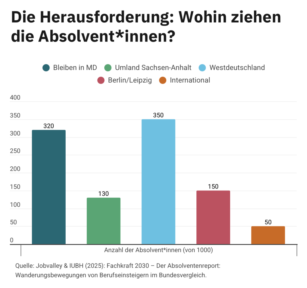 Hier offenbart die Statistik eine schmerzhafte Lücke. Sachsen-Anhalt hat ein „Klebe-Problem“. Nur etwa 38 % bis 42 % der zugezogenen Absolventen bleiben für den ersten Job im Land. Im benachbarten Sachsen sind es immerhin (44 %), in Bayern (über 55 %) – damit ist die Bindung deutlich stärker. Magdeburg bildet für den Export aus: Die Expertise geht nach Berlin, Leipzig oder in den Westen, während die Region leer ausgeht.