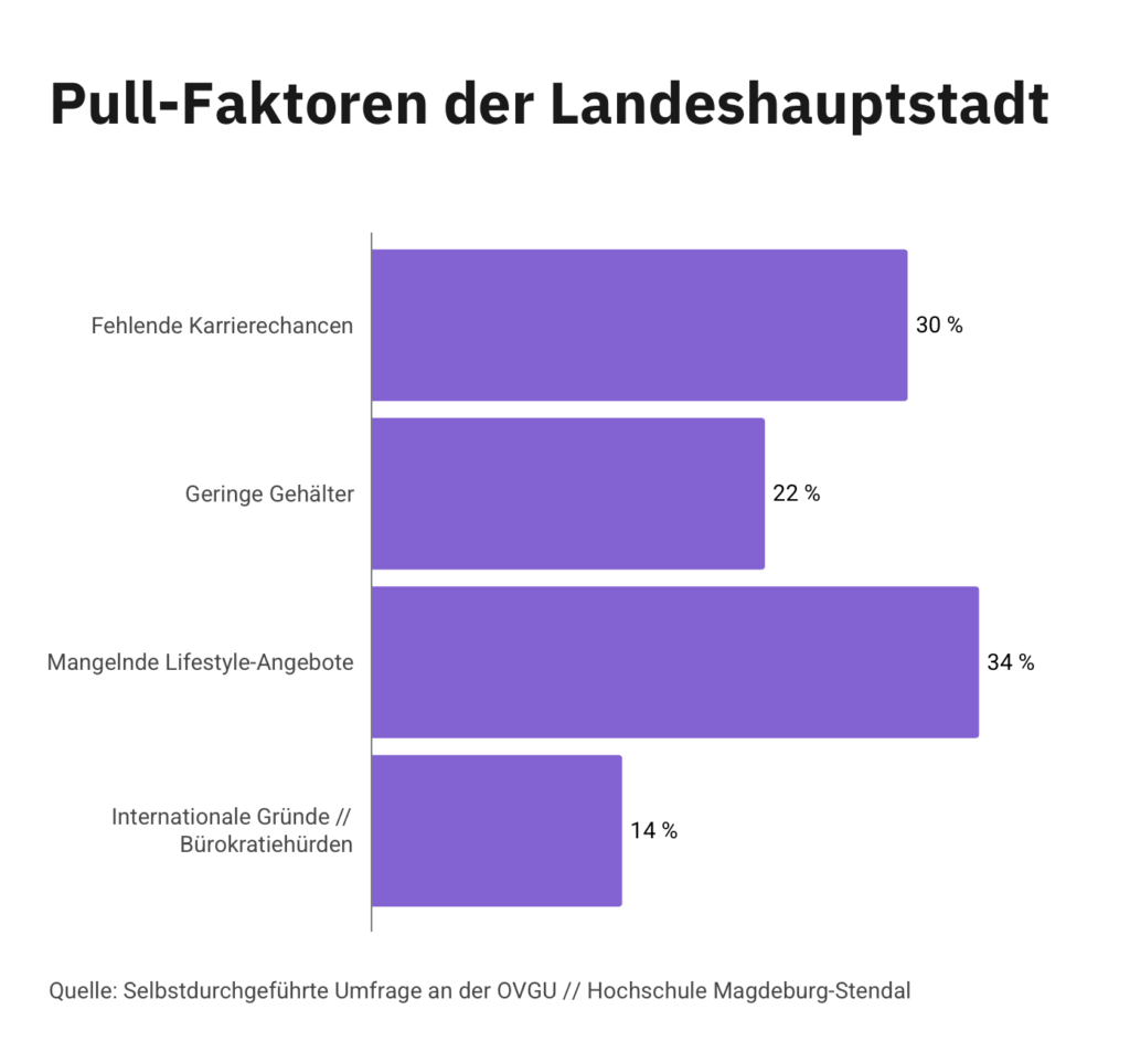 Im weiteren Verlauf der Umfrage haben wir immer wieder ähnliche Antworten erhalten und damit die Push- und Pull-Faktoren Magdeburgs herausgefiltert. Warum bleiben Menschen wie Tobias, aber warum gehen Talente wie Elena und Arav? Die Miete ist der unschlagbare Joker. Ganze 64 % der Befragten kamen wegen der geringen Lebenshaltungskosten (ca. 320 € warm). Dennoch lassen 52 % unserer Interviewpartner die besseren Karrierechancen und attraktiveren Gehalt nicht aus den Augen. Magdeburg punktet beim Geldbeutel, verliert aber beim „Lifestyle“ und den Karriere-Gipfeln.