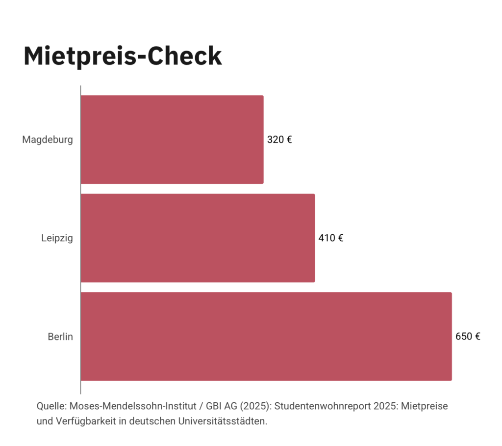 Wir haben recherchiert: Die Kaltmiete für ein WG-Zimmer in Magdeburg liegt im Durchschnitt bei 320 €, in Leipzig bei 410 € und in Berlin bei 650 €. In Berlin zahlt man damit mehr als das doppelte im Vergleich zur preiswerten Studienstadt Magdeburg.