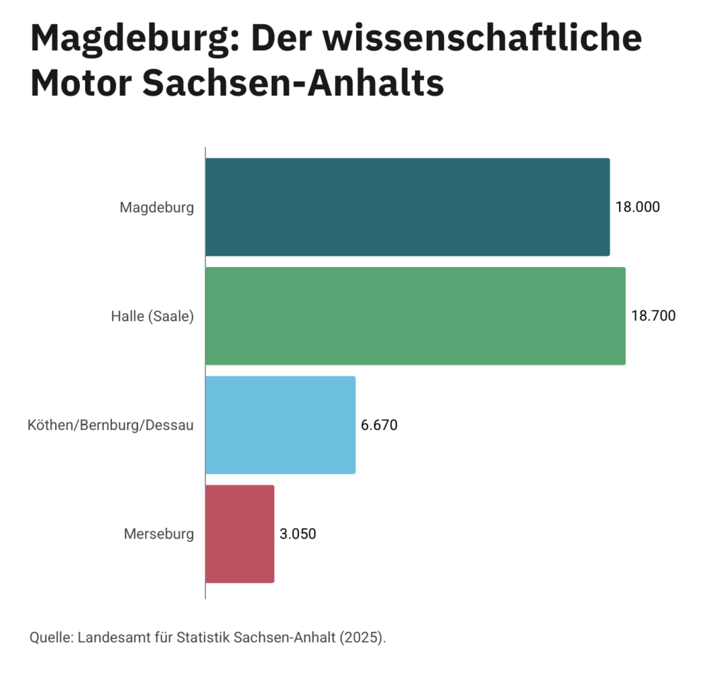 Magdeburg ist zur wissenschaftlichen Herzkammer Sachsen-Anhalts geworden. Während die akademische Landkarte in Sachsen-Anhalt vielerorts schrumpft, wächst der Campus an der Elbe gegen den Trend und entwickelt sich zum Wachstumsmotor der Region. Mit rund 12.800 Studierenden an der OVGU und 5.300 an der Hochschule ist die Stadt das Gravitationszentrum der Region. Während die Uni Halle (MLU) mit einem Minus von 2,6 % kämpft, zieht Magdeburg immer mehr Talente aus über 110 Nationen an. Die Anzahl an Studierenden an der Otto-von-Guericke Universität wächst 2025 um 6,8 % im Vergleich zum Vorjahr.